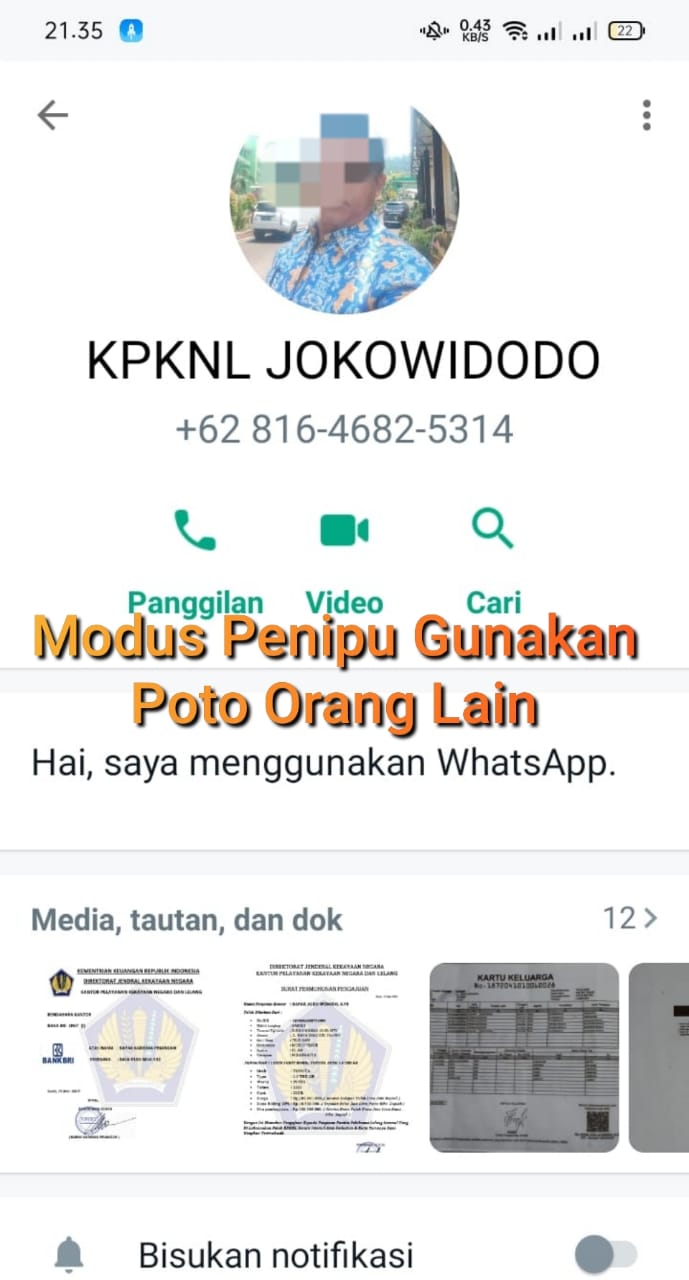 Detikinvestigasi.com.Metro Lampung – Diminta untuk berhati-hati, terindikasi nomor WhatsApp 62 816-4682-5314 adalah aksi penipuan dengan memasang fhoto profil orang terdekat di Kota-Kota anda. Seperti aksinya yang ingin melakukan penipuan salah satu wartawan Radarnews grup, pintarnya aksi pelaku memakai fhoto profil salah seorang, orang yang terkemuka di kota Metro Lampung.
