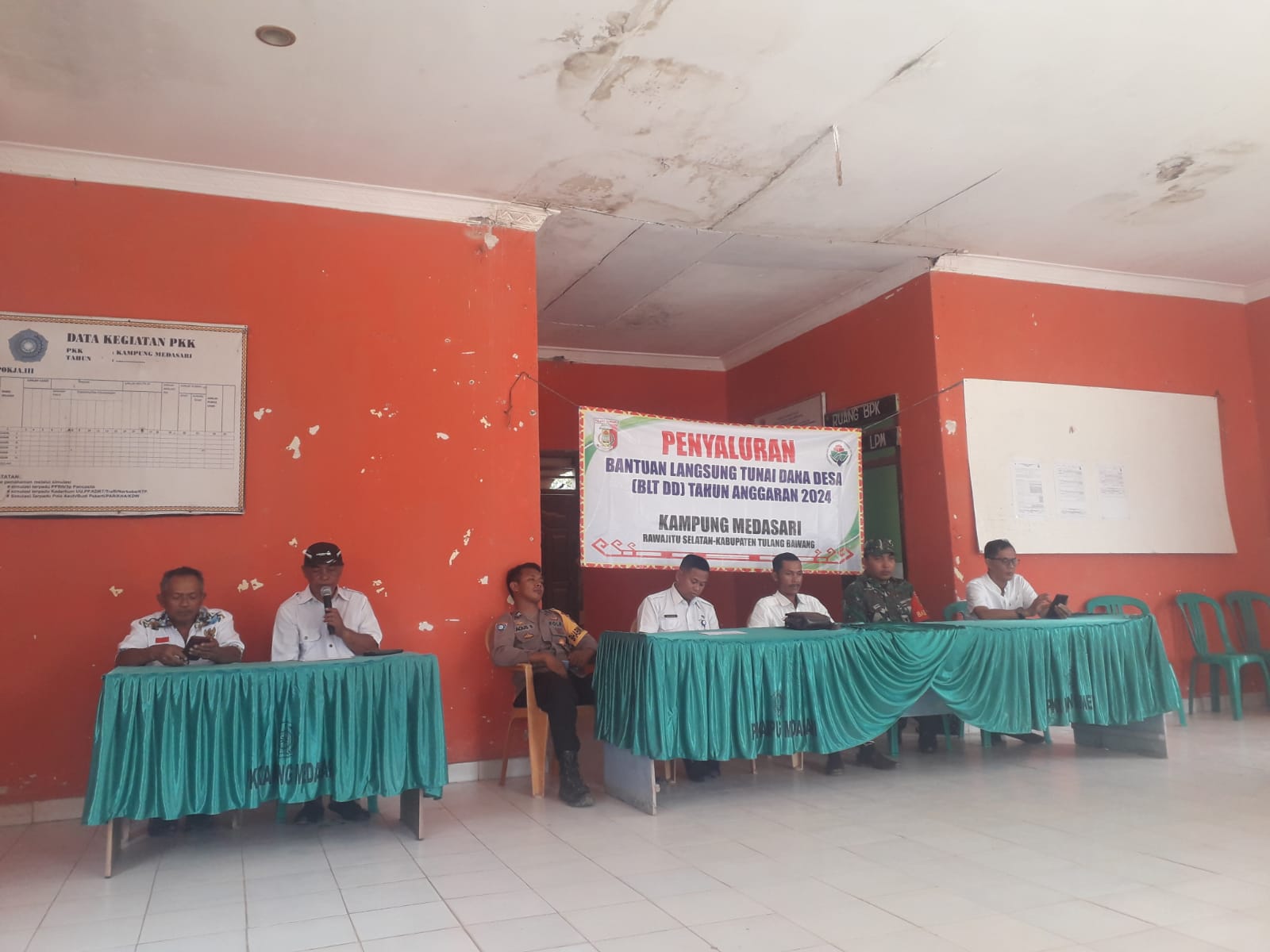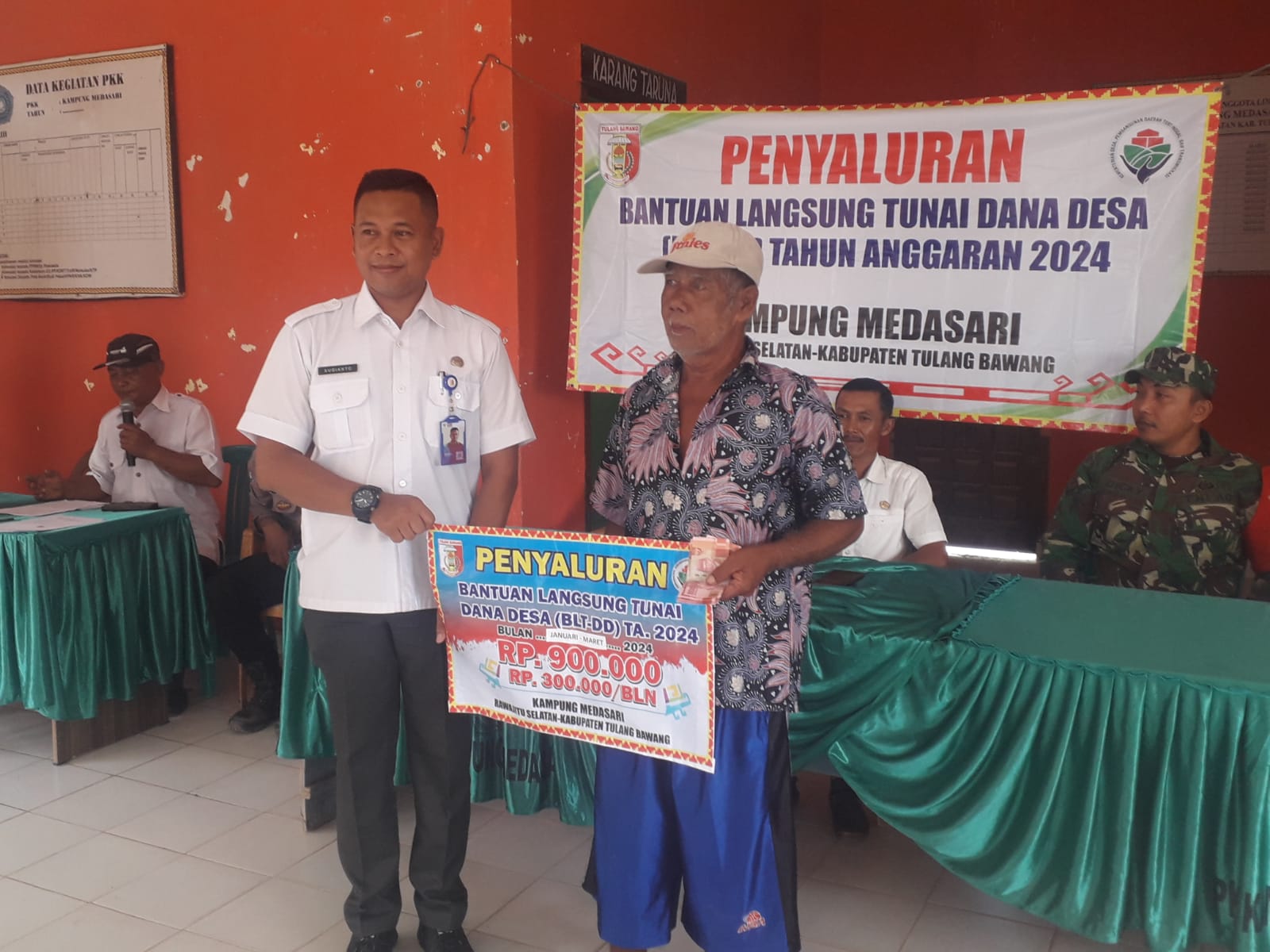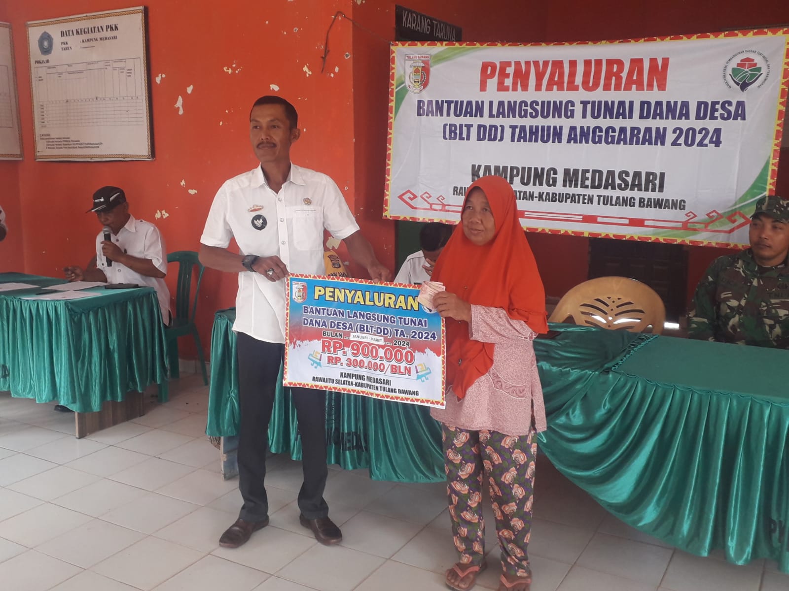 Detikinvestigasi.com.Tulang Bawang– Aparatur Kampung Medasari,Kecamatan Rawajitu Selatan,Kabupaten Tulang Bawang,Salurkan Bantuan Langsung Tunai Dana Desa(BLT-DD) Tahap 1 dari bulan Januari sampai Maret untuk 10 KPM di Balai Kampung setempat,”Pada Rabo 3/4/2024