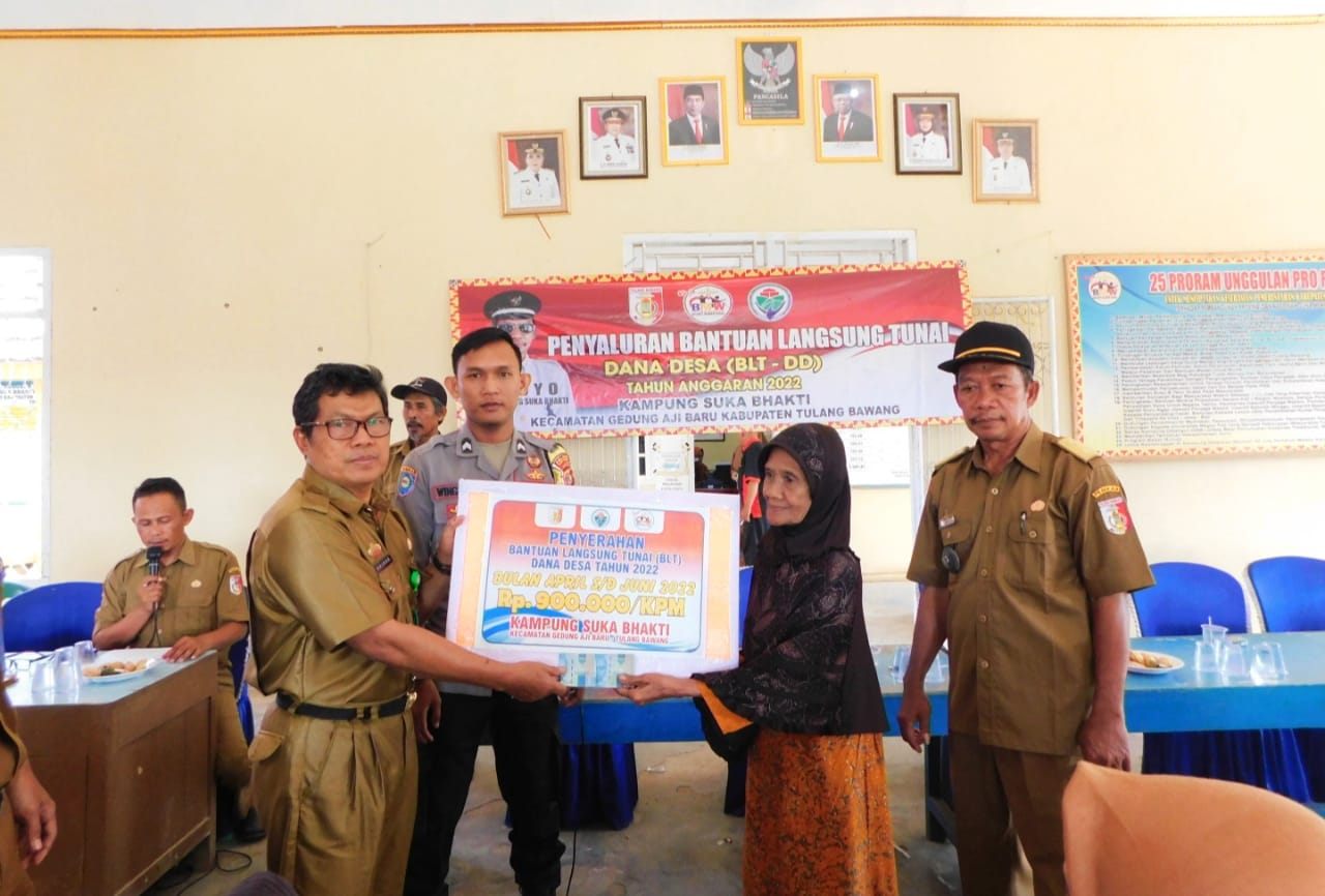 Detikinvestigasi.Com.TUBA.Aparatur Kampung Sukabakti,Kecamatan Gedung Aji Baru,Kabupaten Tulang Bawang,Salurkan dana BLT DD(Bantuan Langsung Tunai Dana Desa)Bulan April sampai Juni 2022 ke 110 KPM(Keluarga Penerima Manfaat)di balai kampung setempat,Selasa 14/6/2022.