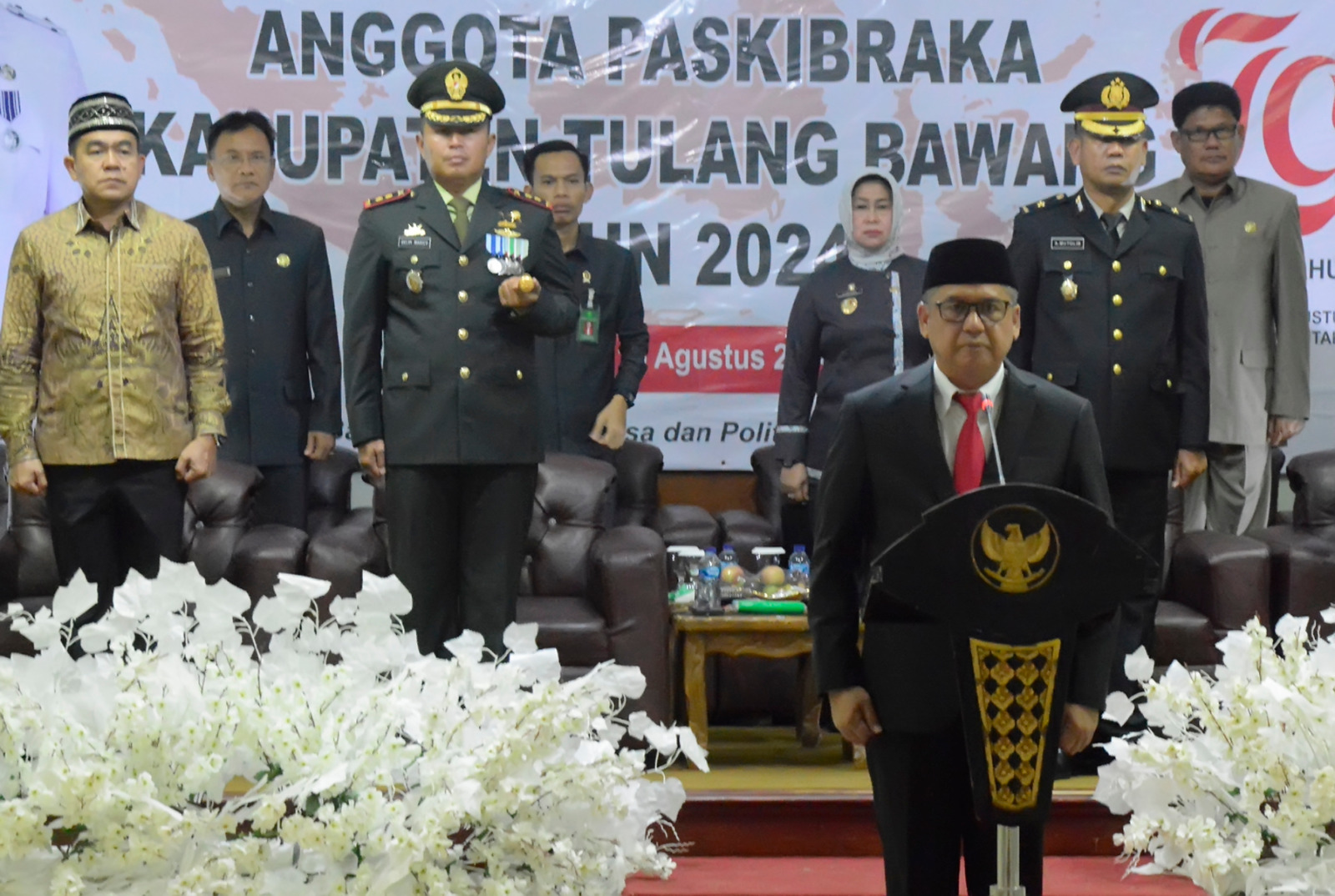Detikinvestigasi.com.Tulang Bawang. Sebanyak 33 anggota Calon Pasukan Pengibar Bendera Pusaka (Paskibraka) Kabupaten Tulang Bawang, TA. 2024 telah resmi dikukuhkan oleh PJ Bupati Tuba, Ir. Ferly Yuledi. SP., MM.MT, bertempat di Aula Islamik Center Jl. Lintas Timur Kecamatan Menggala, Kabupaten Tulang Bawang, Kamis malam 15 Agustus 2024.
