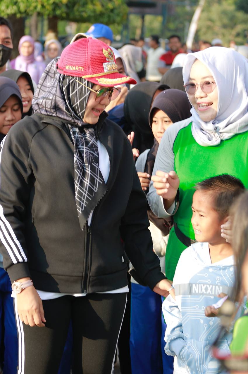 Sebelum melepas peserta jalan sehat, Bupati menyapa para peserta jalan sehat yg kebanyakan merupakan anak- anak SD, bercengkrama akrab dengan anak-anak SD menjadi pemandangan rutin setiap ibu bupati winarti bertemu dengan para penerus bangsa tersebut dan tak lupa Bupati winarti senantiasa menanamkan rasa kebangsaan dan cinta tanah air pada anak-anak dengan cara satu persatu mengucapkan Pancasila.