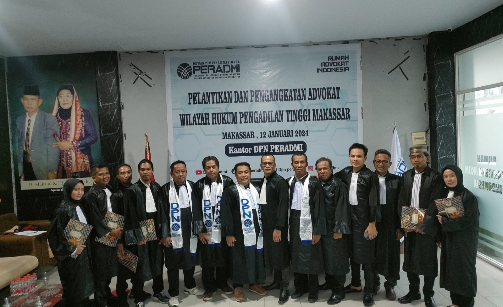 Detikinvestigasi.com.Makassar,Dewan Pimpinan Nasional ( DPN ) Perkumpulan Advokat Muslim Indonesia ( PERADMI ) mengelar Pelantikan dan Pengangkatan Calon Advokat menjadi Advokat PERADMI di Kantor DPN PERADMI di Jalan Tun Abdul Razak Ruko Citraland Celebes, Jumat 12 Januari 2024.