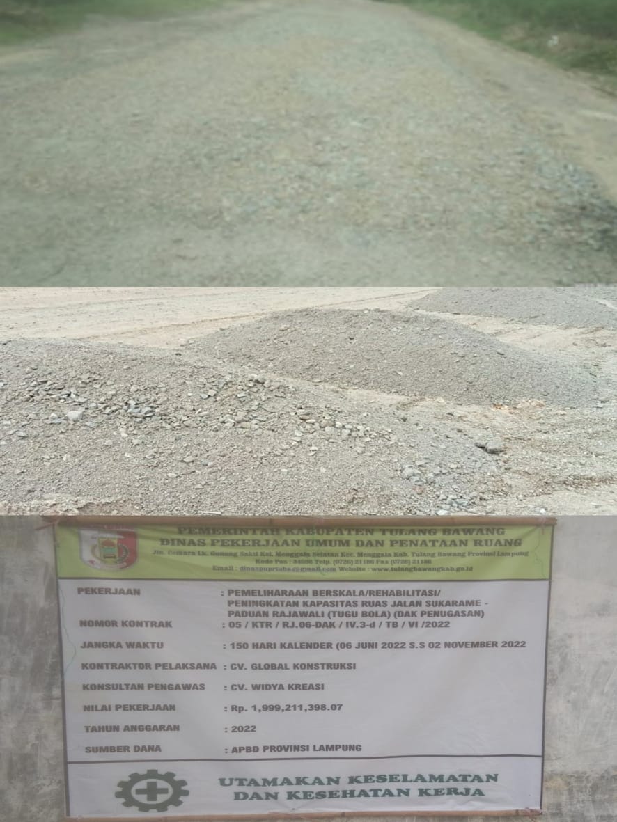 Pemeliharaan Peningkatan ruas jalan yang bersumber dari anggaran Dana Alokasi Khus(DAK)PUPR Kabupaten Tulang Bawang yang terletak di Kampung Paduan Rajawali dan Kampung Aji Jaya KNPI terindikasi dikerjakan asal jadi,kuat dugaan adanya permainan Kong kalikong antara kontraktor dan Oknum Dinas PUPR Tulang Bawang.