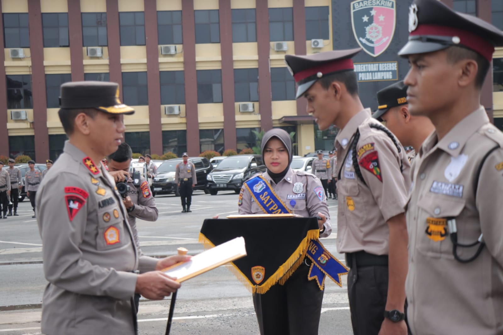Usai upacara, kegiatan dilanjutkan dengan penyerahan piala kepada sejumlah satpam. Atas nama: 1. Sugiyono Satpam Unila atas pengabdian tugas sebagai satpam sejak tahun 1991 s.d. pensiun TMT 1 januari 2023 tanpa ada pelanggaran dinas 2. Hendriyanto Satpam Pertokoan Pasar Bawah Tanjung Karang, telah berhasil mengamankan pelaku pencurian 2 unit tv led 32 inc dengan total kerugian Rp.7.000.000,(tujuh juta rupiah) di pertokoan pasar bawah tanjung karang Bandar Lampung.