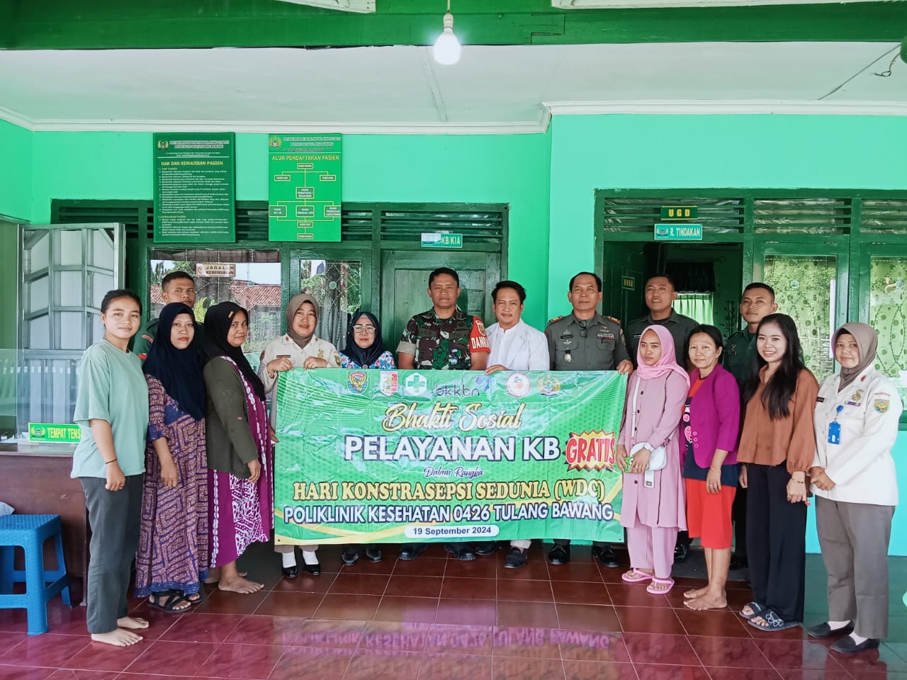 Komandan Kodim (Dandim) 0426 Letkol Delvy Marico, S.E., M.I.P melalui Danramil 02/Mg Kapten Inf Hasin mengikuti kegiatan bakti sosial pelayan KB gratis memperingati hari kontrasepsi sedunia 2024 di poliklinik kesehatan 0426/TB, Kamis 19 September 2024.