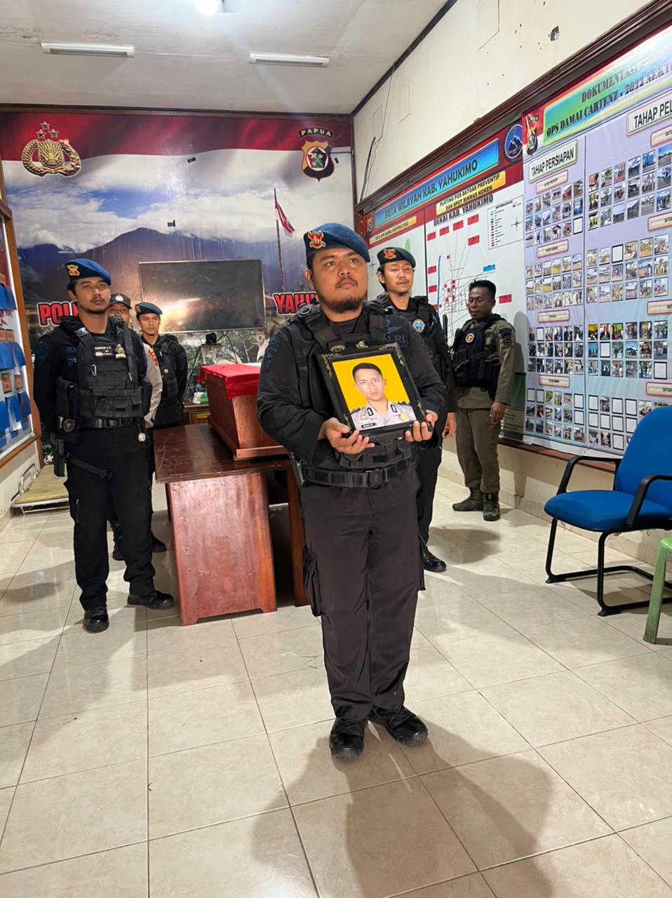 “Sedangkan Bripda Gilang Aji Prasetyo usia 23 tahun yang meninggal dunia mengalami luka tembak dan sempat dirawat di RSUD Dekai.”