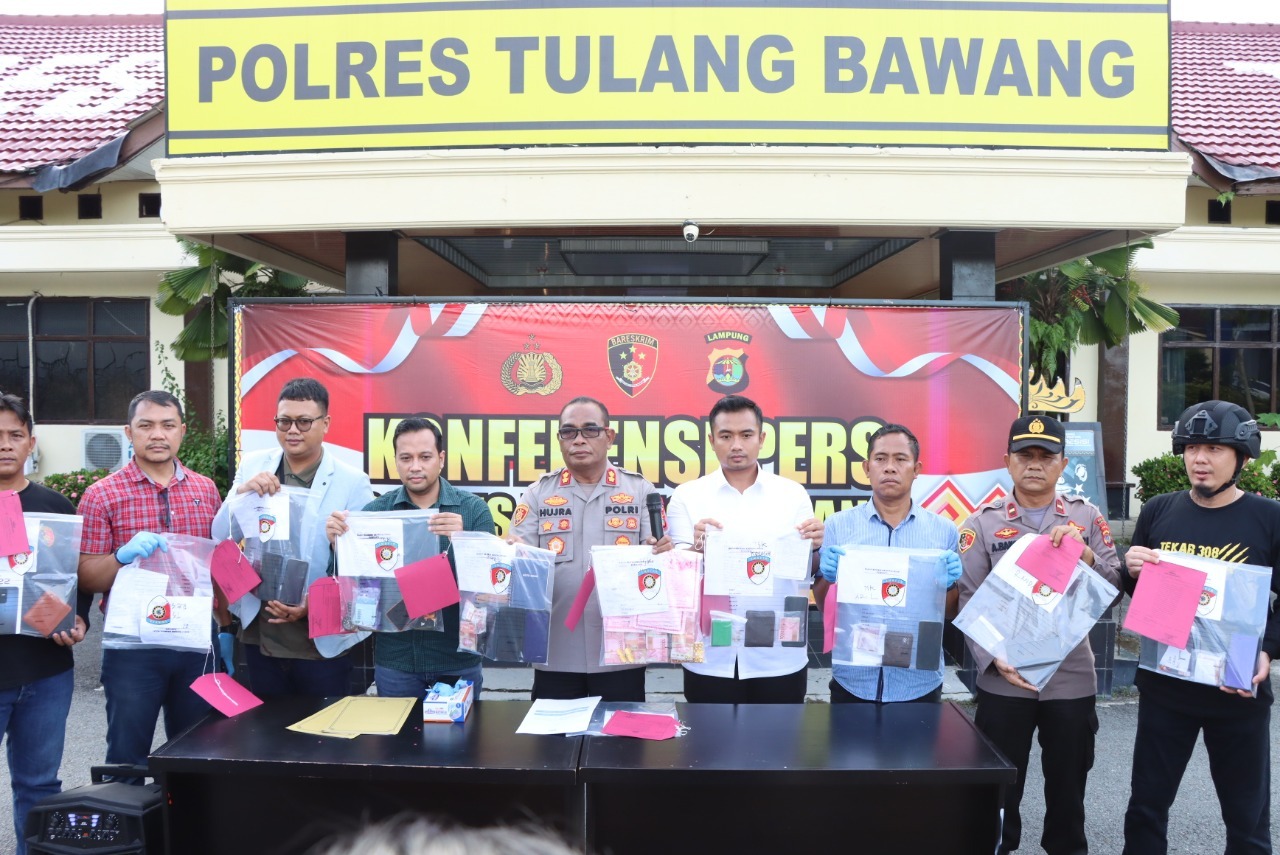 “Para pelaku ditangkap hari Rabu (09/11/2022), pukul 19.00 WIB, di sebuah rumah yang ada di Kecamatan Rawa Jitu Selatan,” kata Kapolres Tulang Bawang, AKBP Hujra Soumena, SIK, MH, yang didampingi Kasat Reskrim, AKP Wido Dwi Arifiya Zaen, SIK, MH, KBO Satreskrim, Iptu Abdullah, Kanit Tipidter Satreskrim, Iptu Andy Ruswandi, SH, MH, dan Kasat Tahti, Ipda A Bancin, saat menggelar konferensi pers, hari Kamis (10/11/2022), pukul 16.10 WIB, di Mapolres setempat.