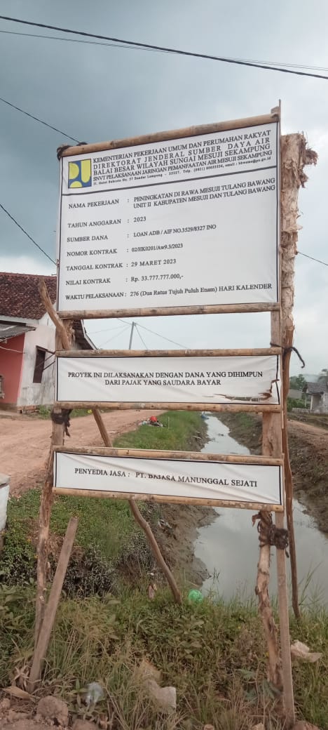 Proyek pembangunan Peningkatan Dirawa Mesuji Tulang Bawang Unit ll Kabupaten Mesuji dan Tulang Bawang yang berada di Tiga Desa,yaitu Desa Sidang Isomukti,Sidang Sidorahayu dan Sidang Muara Jaya,Kecamatan Rawajitu Utara,Kabupaten Mesuji,dengan pagu anggaran mencapai. Rp. 33.777.777.000.Diduga kuat pekerjaan proyek tersebut amburadul tidak sesuai dengan Juknis dan Rancangan Anggaran biaya(RAB)dan terindikasi adanya Mark’Up anggaran.