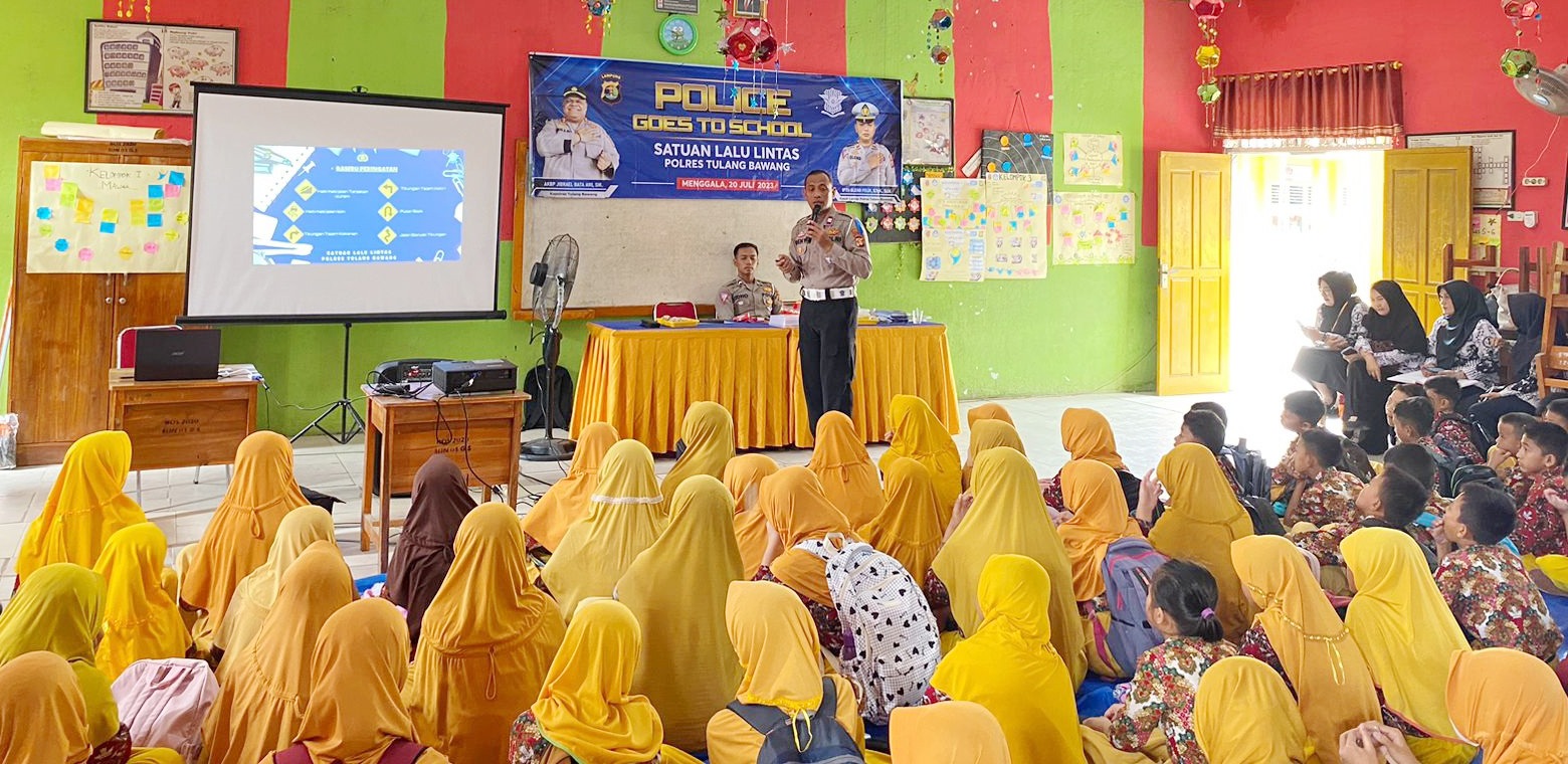 Satuan Lalu Lintas (Sat Lantas) Polres Tulang Bawang, Polda Lampung, menggelar kegiatan Police Goes To School di Sekolah Dasar (SD) yang ada di wilayah hukumnya.