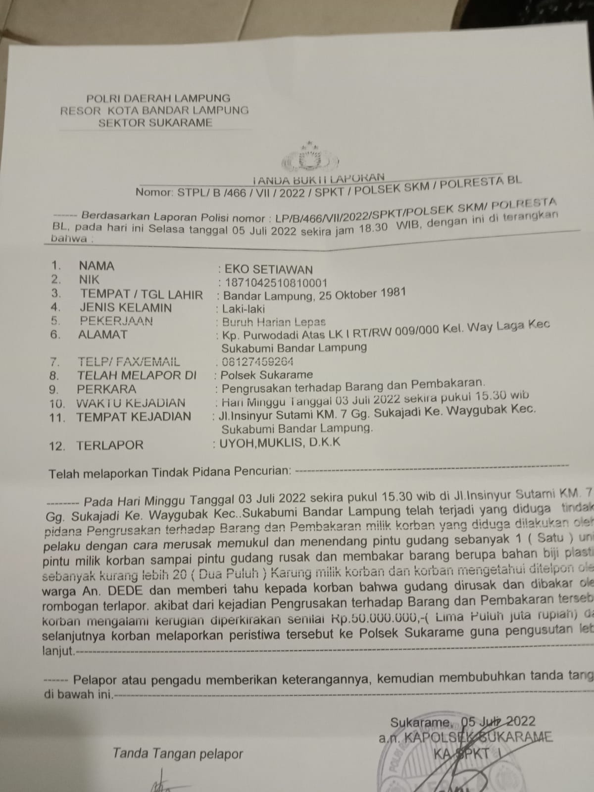 Kemudian setelah itu HR (Pitul) CS diduga melakukan Pengrusakan dan Pembakaran Gudang dimana si Pemilik Gudang telah mengambil langkah hukum berupa Laporan Polisi berdasarkan Laporan Polisi Nomor : LP/B/466/VII/2022/SPKT/POLSEK SKM/POLRESTA BL pada Kantor POLRI DAERAH LAMPUNG RESOR KOTA BANDAR LAMPUNG SEKTOR SUKARAME.