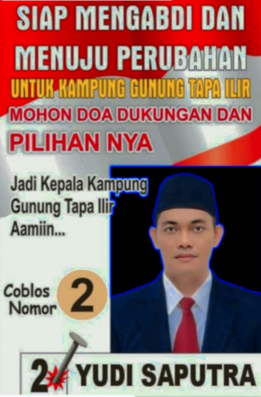 Salah Satu Calon Kepala Kampung Gunung Tapa Ilir,Kecamatan Gedung Menang,Kabupaten Tulang Bawang,Yudi Saputra,dengan nomor urut 02,Siap menjadikan Gunung Tapa Ilir menuju perubahan yang lebih baik dan mensejahtrakan masyarakat baik di Bidang Perekonomian sampai ke Bidang Inprasetruktur Kampung.